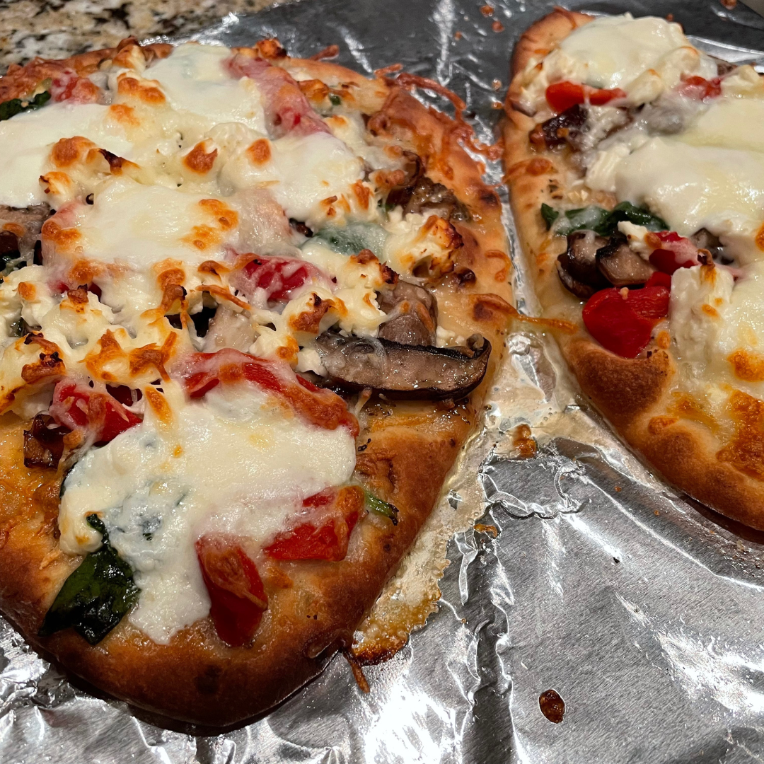 We often have Mediterranean flatbread pizzas with homemade chicken cutlets or just with a simple Caesar salad kit. I’ve also been known to add grilled chicken, green onions and shaved asiago as additional toppings.